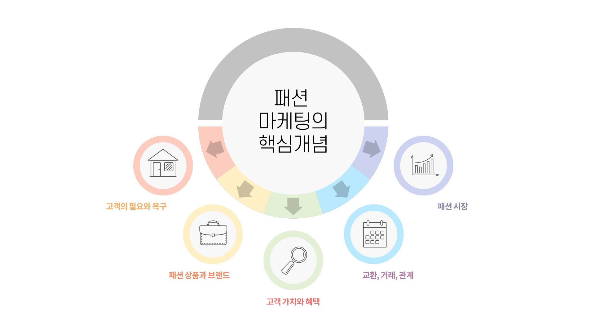 패션 마케팅의 목표를 달성하기 위한 핵심 개념은 총 다섯가지 정도로 정리할 수 있으며, 이들은 밀접한 상호 관련성을 가짐.
