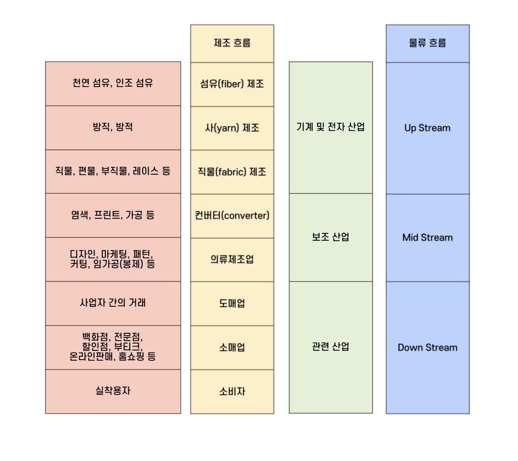 패션 산업의 구조는 제조 흐름과 물적 흐름으로 구분됨.